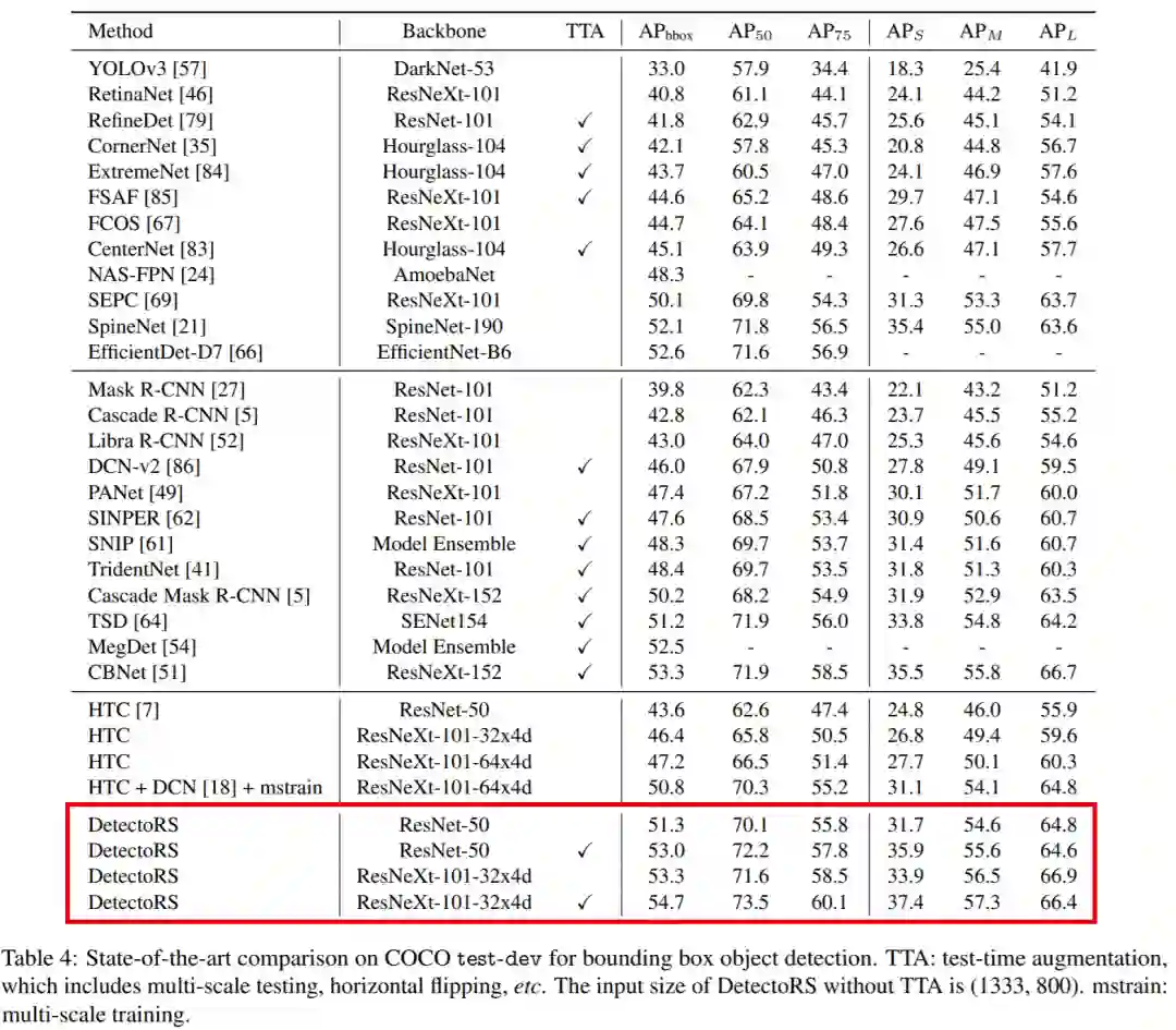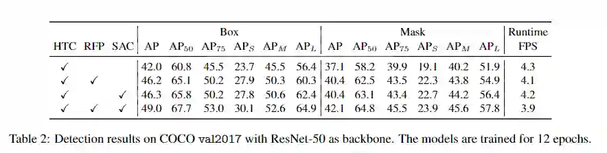 训练数据集作者采用的COCO数据集。作者使用mmdetection 实现了Detec-toRS。baseline模型是HTC ,在单个NVIDIA TITAN RTX显卡上测试。为了方便对比,整体的实验配置和HTC网络保持一致。