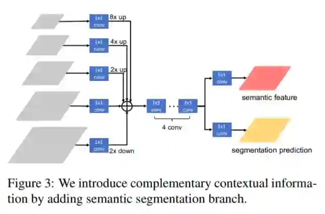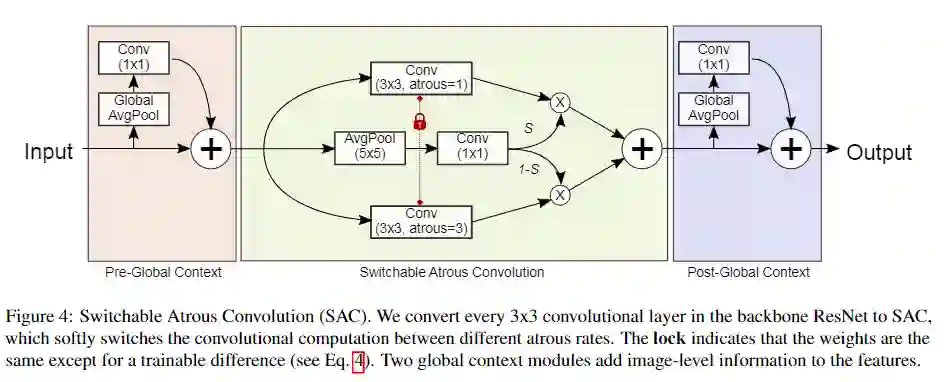 作者将主干网络ResNet中的每个3x3卷积层都转换为SAC,从而在不同的空洞率之间实现对卷积计算的软切换。上图中的锁表示权重相同,只是训练的细节差异有所不同。两个全局上下文模块将图像级信息添加到特征中。