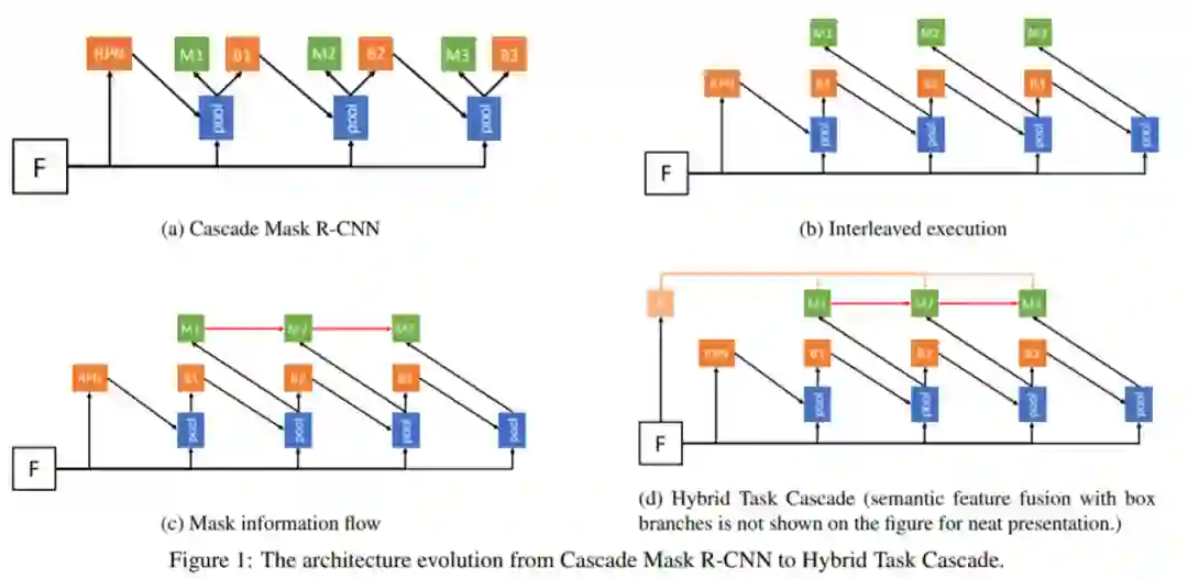 HTC是一种多任务多阶段的混合级联结构,融合了一个语义分割的分支来增强 spatial context。整个框架的演进可以用上面的四张图来表示,其中 M 表示 mask 分支,B 表示 box 分支,数字表示 stage,M1 即为第一个 stage 的 mask 分支。HTC这种框架取得了明显优于 Mask R-CNN 和 Cascade Mask R-CNN 的结果。