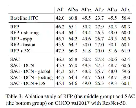 SAC中锁定机制,通过将一个权重设置为w而另一个权重设置为w +Δw,其原因如下:目标检测器通常使用预训练的checkpoint来初始化权重。但是,对于从标准卷积层转换而来的SAC层,较大的空洞率rate的权重通常是缺失的。由于可以通过相同的权重以不同的粗略度粗略地检测出不同比例的物体,因此用预训练模型中的权重来初始化丢失的权重是可以的。本文使用w + ∆w表示从预训练checkpoint开始的缺失的权重,并使用0初始化∆wi。当固定Δw= 0时,通过实验观察到AP下降了0.1%,但是没有锁定机制的∆w会使AP降低很多。