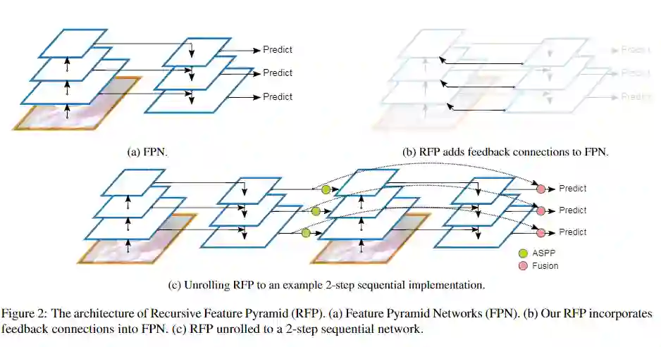 RFP提出的递归方法与最近提出的CBNet 中的递归方法相似,CBNet方法中将多个主干级联以输出特征作为FPN的输入。相比之下,RFP通过包含ASPP结构的FPN和有效的融合模块一起来执行递归计算。