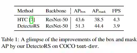 将递归特征金字塔(RFP,Recursive Feature Pyramid)和可切换的空洞卷积(SAC,Switchable Atrous Convolution)合并形成了DetectoRS,大大增强了目标检测的性能。具体来说,在COCO test-dev数据集上达到了54.7% box AP的SOTA性能,同时在COCO实例分割任务上达到47.1% mask AP的的性能,在COCO全景分割任务上达到49.6% AQ的性能。