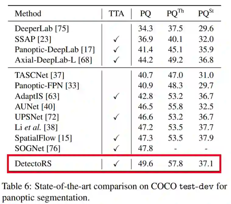 在COCO test-dev 全景分割中,DetectoRS达到49.6% PQ,相比于其他算法有将近两个点的提升。