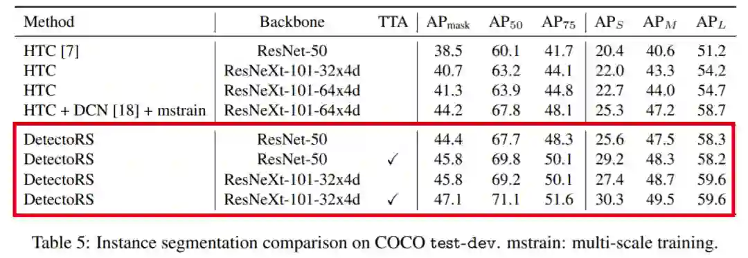 在COCO test-dev 实例分割中,DetectoRS在使用ResNet-50和ResNeXt-101-32x4d作为主干网络时达到47.1% AP,目前与ResNeSt并列排名第一。