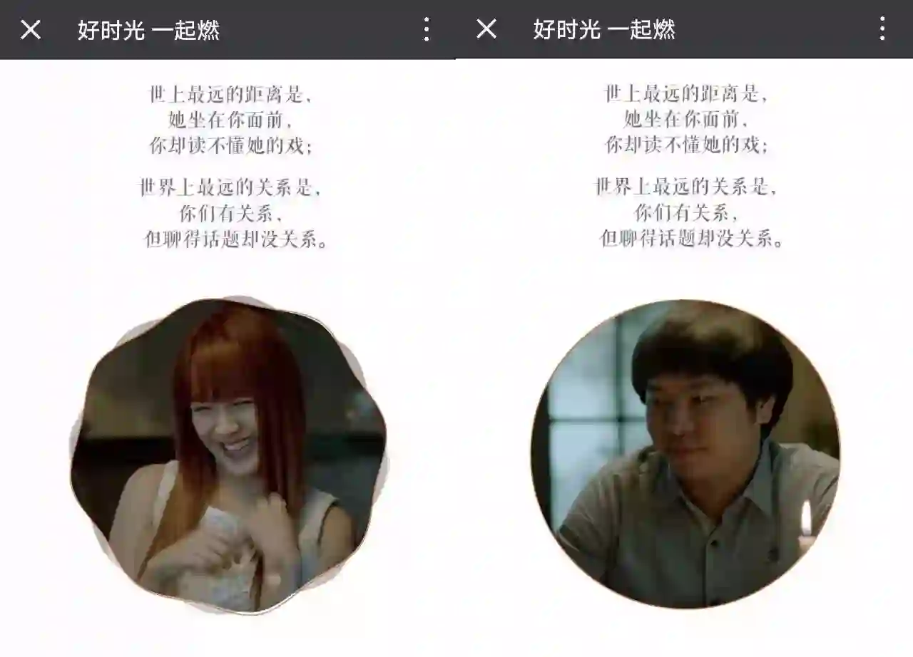 在此次H5中,小编特别喜欢的一点就是加入了圆形画幅。最先把圆形画幅带进主流视野的非冯小刚导演莫属,此次加进了H5,画框还能根据人物情绪旁边出现波纹浮动,相当妙的创意,这个给100分不怕你骄傲。