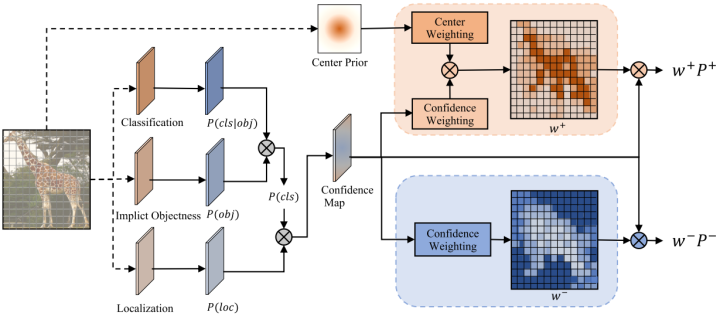 与 FreeAnchor 相似,将分类和定位联合看成极大似然估计问题,学习出样本的置信度 Confidence Weighting,即下面的 C(Pi):