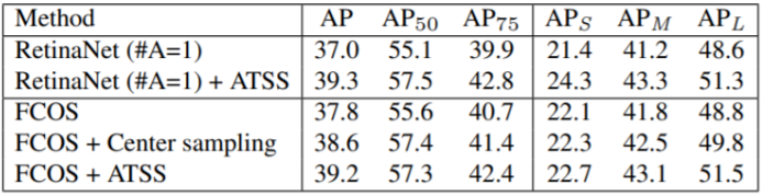 根据下表可以发现,即使 anchor box 数量为 1 的 RetinaNet 和 FOCS 在都加上 ATSS 策略之后,效果都有明显的提升,这也证明了 ATSS 策略的有效性。