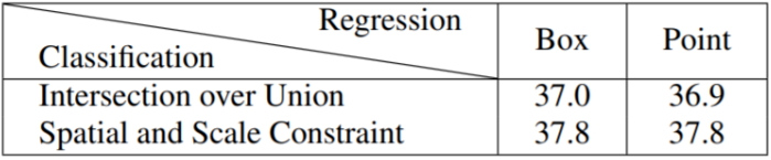 最后通过交叉实验,发现在相同正负样本定义下情况下,RetinaNet 和 FCOS 性能几乎一样,而且 spatila and scale constraint 的方式比 IOU 的效果好,如下表: