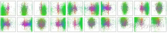 Detr 也在 coco 2017 val 上对把每个 object query 预测的框做了可视化,如下,选取 N=100 中的 20 个 object query,可以看到不同的 query vector 具有不同的分布(有些注重左下角,有些注重中间…),可以想成:有 N 个不同的人用不同的角度进行观测。