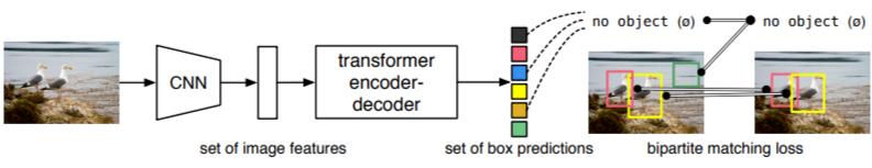 使用 Hungarian algorithm 实现预测值与真值实现最大的匹配,并且是一一对应。不会多个预测框匹配到同一个 ground truth 上,这样就无需 NMS 后处理了。