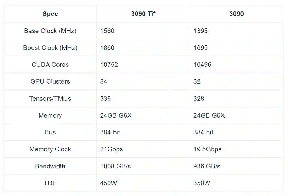上图为此次大会之前外媒关于3090 TI的硬件参数预测以及与3090的对比。可以看出,从英伟达已经公布的数据(显存规格、容量、总线)看,表中左列的预测是准确的。