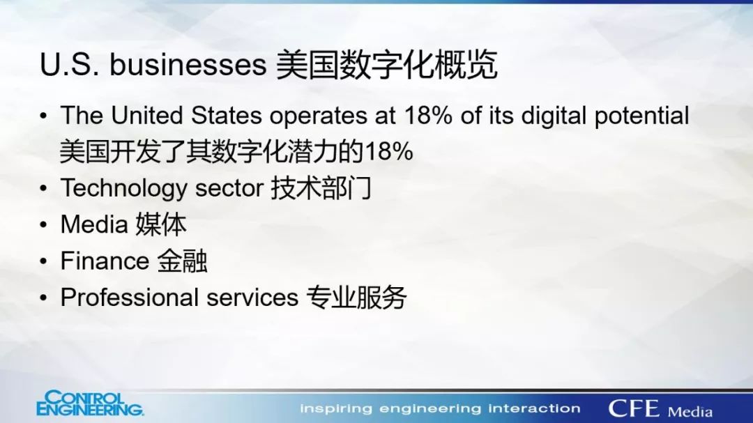 Rozgus主编认为,当前在全球范围内,方兴未艾的数字化转型进程总体上还仅仅处于开端,仍有极具规模的市场潜力有待开发。以美国和欧洲两大市场为例,美国仅开发了其数字化潜力的18%,主要集中在技术部门、媒体、金融及专业服务业;而欧洲也仅开发了其数字化潜力的12%,主要集中在信息和通信技术、媒体及金融业。尤其是对于中欧和东欧而言,到2025 年,数字化能够帮助增加的GDP 将高达2000 亿欧元。