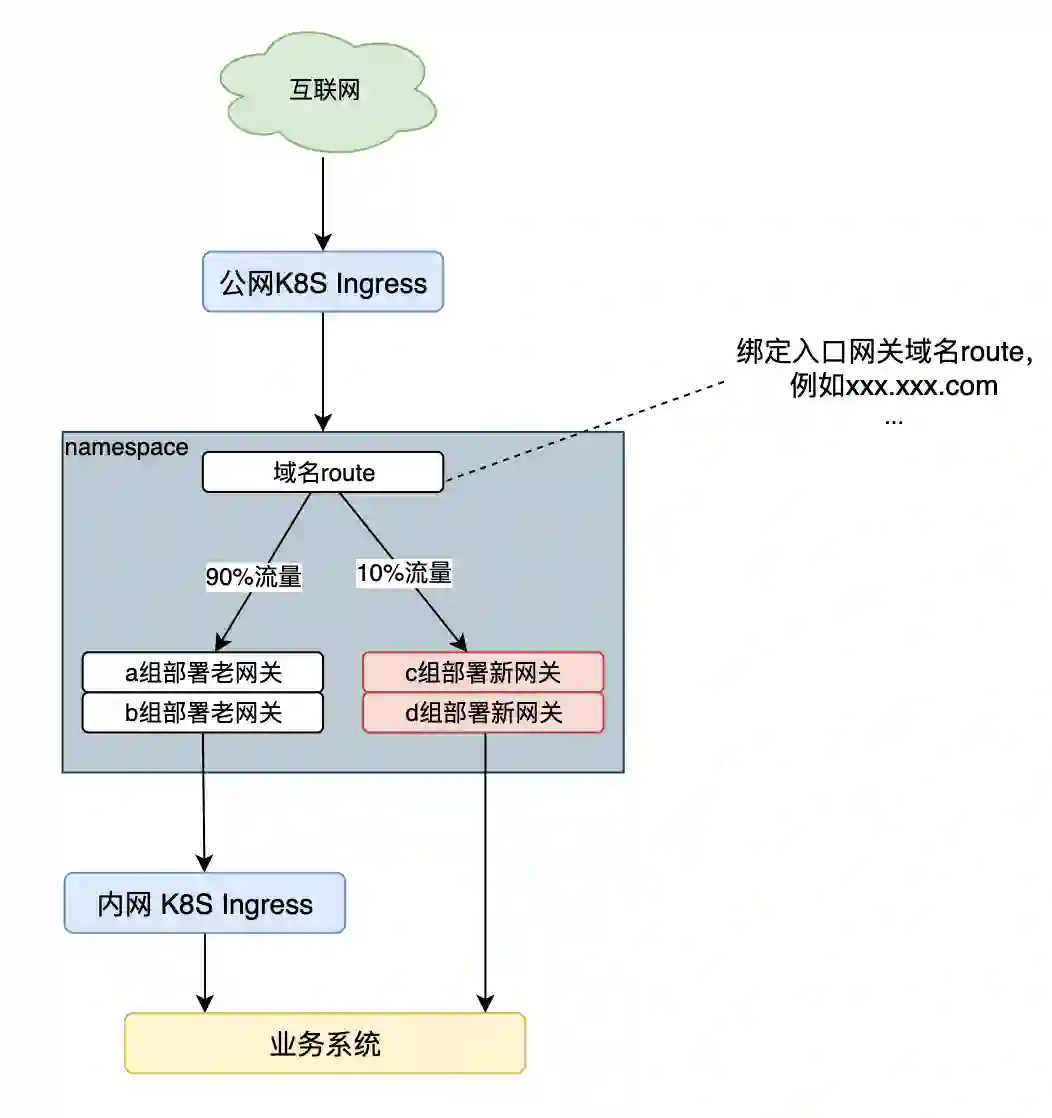 之前还呗使用的 K8s 容器是 OpenShift(现已升级为 ACK 集群),其中 Ingress 是 Haproxy 搭建。由于公网 K8s Ingress 的 Haproxy 不能把一个域名的流量转发到两个 Namespace 的路由中,因此考虑把新网关部署在和老网关相同的 Namespace 下。即域名的路由下挂载多个服务,之后便可以通过路由调整流量比例,控制流量走新网关还是老网关。