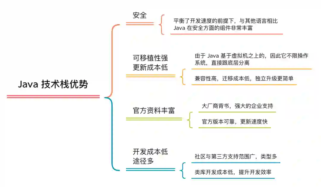 近 15~20 年以来,大部分金融系统基本都选择了 Java 技术栈,深究其原因,我们认为主要是因为 Java 技术栈有以下几点优势。