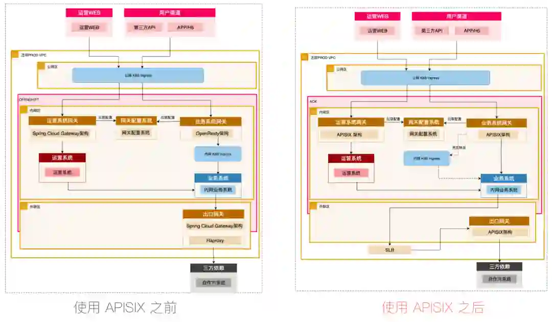 在架构层面,还呗在使用 APISIX 前后呈现了如下图所示的变化。