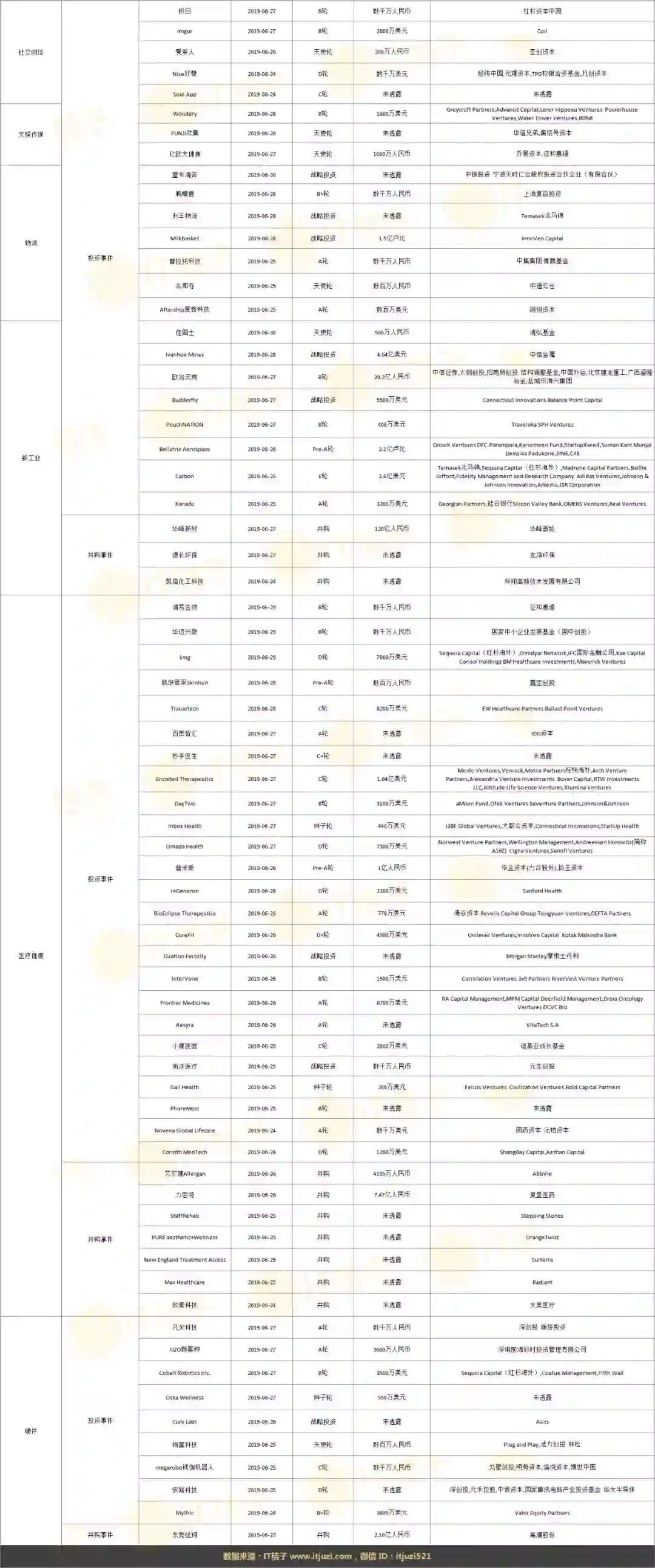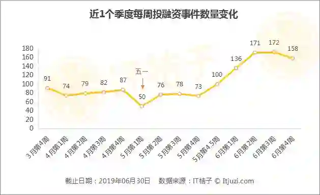 总体来看,六月的投资市场较五月活跃。上周发生了 158 起投融资并购事件,较上上周事件数量有所下降,投资节奏有放缓趋势。