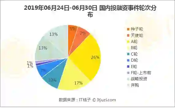 从轮次分布来看,本周A轮投资事件占比较大,发生 41 起,占比 26%;其次,B轮排列第二,发生 27 起,分别占比 17%;战略投资、并购事件数量并列第三,分别发生 21起,各占比 13%。