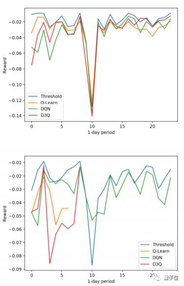 在AWS上的运行效果受到了运行时间的限制。研究人员在AWS系统上的运行阈值基线和DQN模型的时间只有3周,但运行D3QN的时间只有一个星期。为了帮助初始测试和开发AWS的环境,研究人员故意将tabular-based Q-learner的运行时间缩短了。