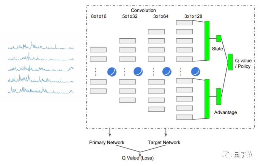 上图就是一张基于竞争架构的DDQN(double deep Q-learning network)结构图。SeLU函数激活了四个卷积层,并且没有进行池化操作。研究人员没有在最终输出前插入完全连接层,而是将最后卷积层的平坦特征图减半,以此计算状态和效果。