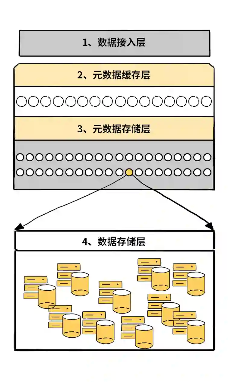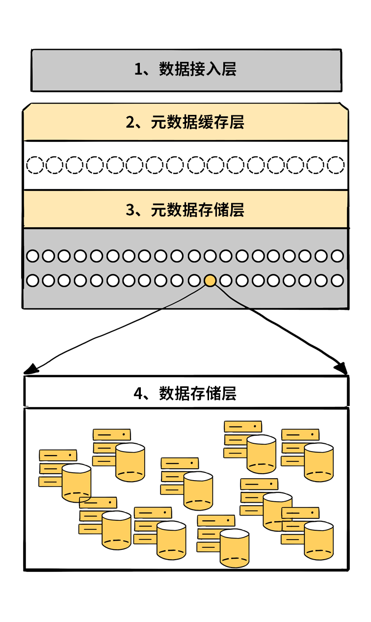 因为目标是治理超大规模集群,所以 YottaStore 不能完全依照原来的分布式系统方式去设计,架构上会有所差别。传统分布式系统分为三层,数据从应用层进入系统后,会由 Master 管理节点去分配存储层的 Chunk 服务器,再进行数据存储。读写请求都要通过 Master 节点,Master 也需要存储“元数据”信息,所以集群规模大了后 Master 节点往往就变成了系统的瓶颈。