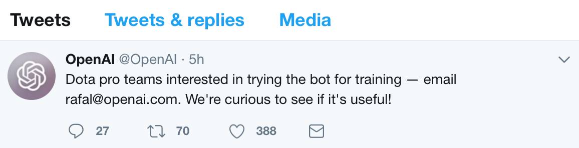 于是,OpenAI 今天正式发了推特,邀请 Dota 职业战队来使用他们的 AI 作为训练手段,并很希望看看“是否有用”。