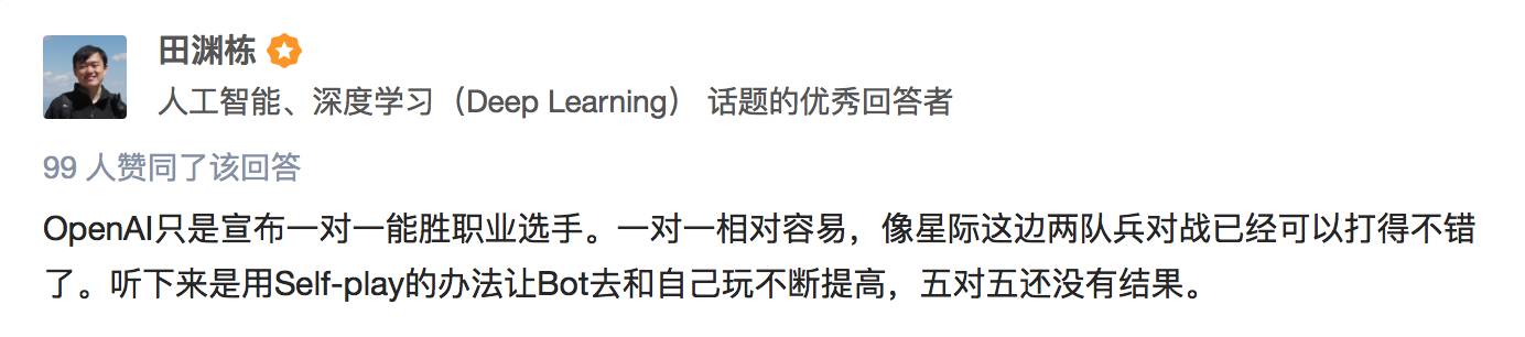 关于这一点,卡耐基梅隆大学机器人系博士,Facebook人工智能组研究员田渊栋在知乎上表示:OpenAI只是宣布一对一能胜职业选手。一对一相对容易,像星际这边两队兵对战已经可以打得不错了。听下来是用Self-play的办法让Bot去和自己玩不断提高,五对五还没有结果。