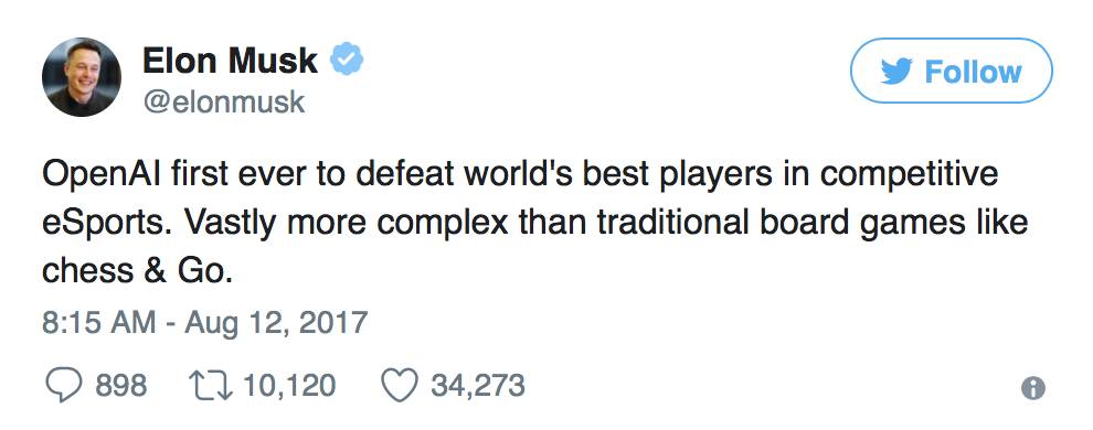 这就是为什么 OpenAI 的新闻如此让人震惊。怎么会这样呢?最近有没有我没有觉察到的突破?当我开始更多地了解DotA 2机器人正在做什么,它是如何训练的,以及使用什么游戏环境,我得出的结论是,这是一个令人印象深刻的成就,但不是新闻界所认为的 AI 突破。这就是这篇文章要讲的东西。我想提供一个清醒的解释:他们带来了什么新东西。有一个过度夸张人工智能的进步是很危险的,比如以下这两条推特就很容易误导大众: