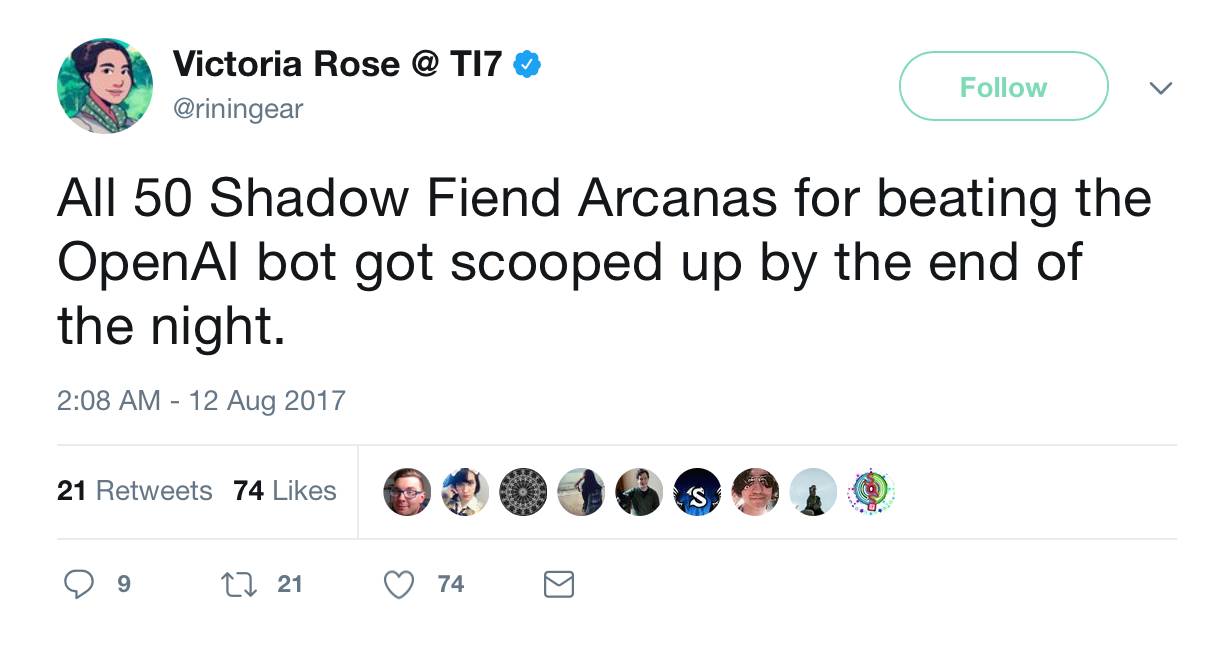 然而,就在 AI 似乎要成为非常有潜力的训练方法时,昨天,似乎是为了捍卫人类玩家的尊严,有50位“影魔”都击败了 OpenAI 的机器人。