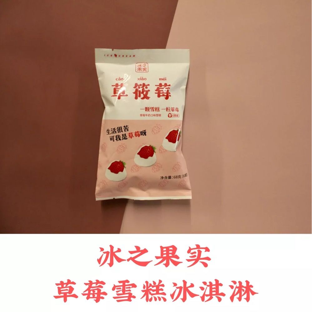 一款从名字上就刻意卖萌的冰淇淋。文案还停留在李诞那句用烂了的名言——「众生皆苦,唯有你是草莓味的。」