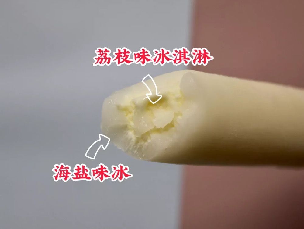 一口下去才发现,外面的奶冰竟然真的是海盐味的,冰沙一样的口感,咬着不费力。里面裹着荔枝味十足的冰淇淋,海盐的咸味和荔枝的甜完美融合,清爽解暑,令人惊喜。