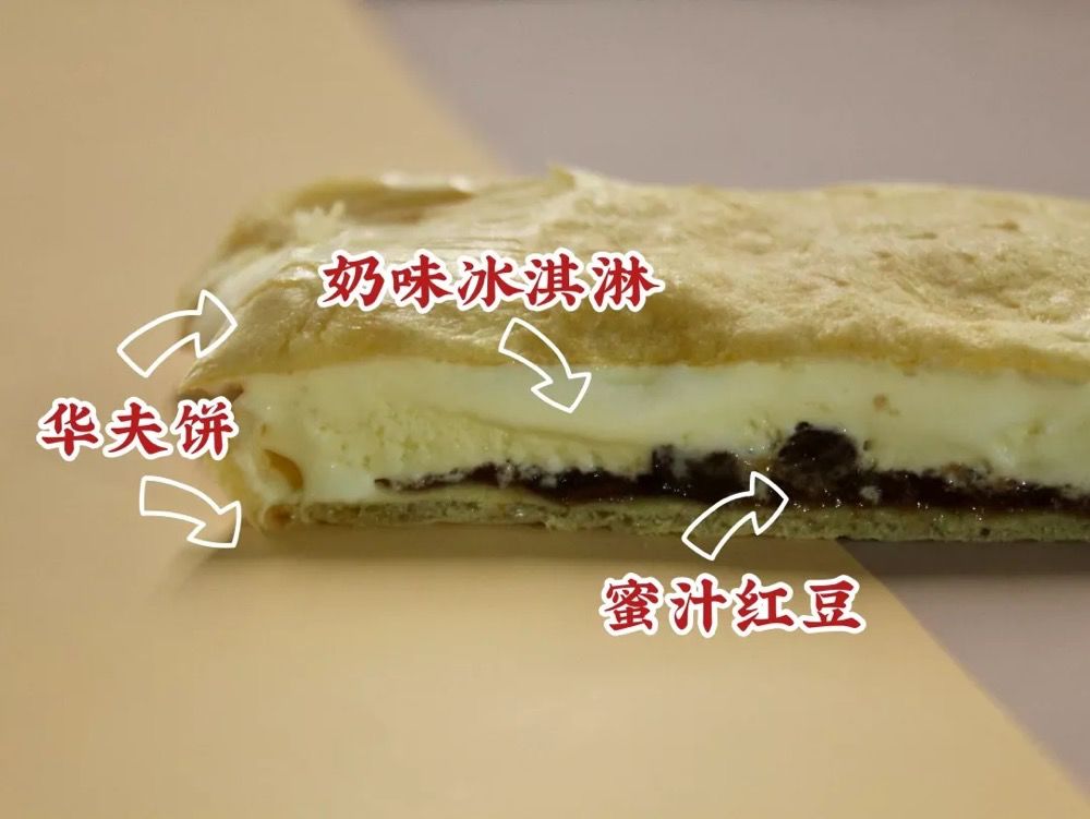 内馅是蜜汁红豆和奶味冰淇淋,冰淇淋浓度适中,红豆果酱偏甜,甜食狂热爱好者的可能会喜欢。外壳华夫饼是软软的,有点韧,不太好咬。