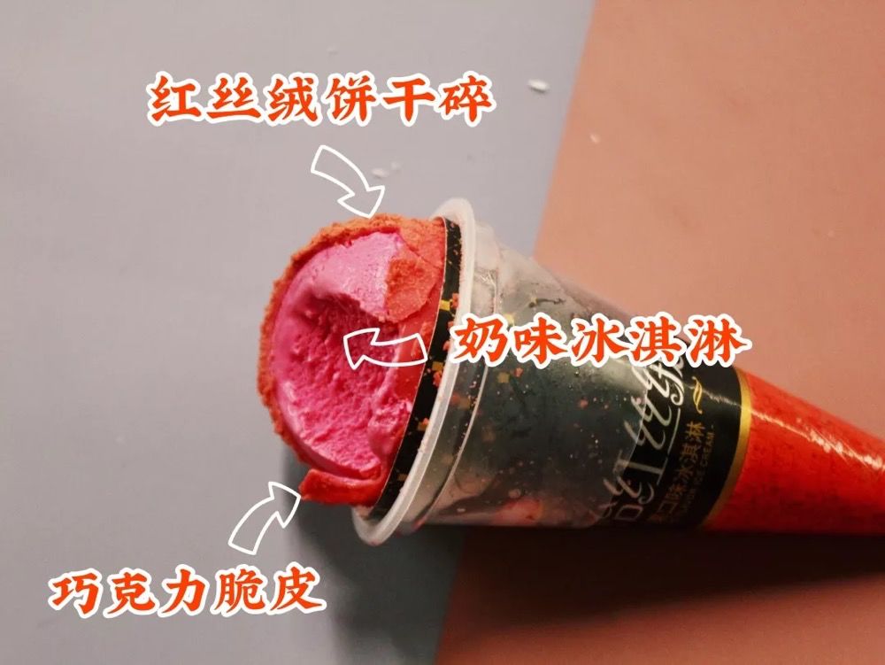 这款外观上看起来和甜筒款一样,外面一层红红的「红丝绒饼干屑」,外加一层红红的巧克力脆皮,红红火火恍恍惚惚。