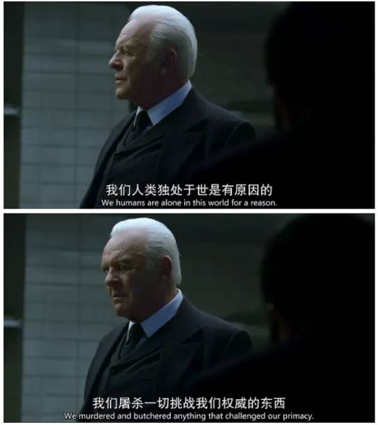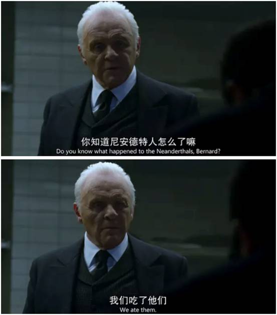 “我们人类独处于世是有原因的,我们屠杀一切挑战我们权威的东西。你知道尼安德特人怎么了嘛?我们吃了他们。”