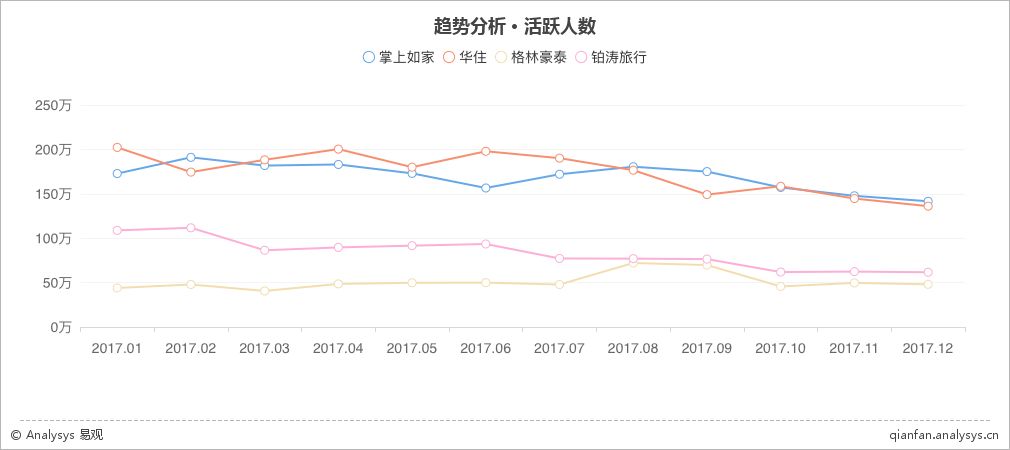 线下酒店方面,掌上如家、华住、铂涛旅行、格林豪泰的月活跃人数都受季节性影响出现了小幅的环比下降。其中掌上如家和华住分别以141.59万和136.08万月活跃用户领跑线下酒店App。纵观全年,线下酒店度过了较为平稳的一年,但厂商间的份额之争仍然激烈。根据易观千帆监测数据显示,掌上如家和华住全年都处在交替领先的状态。铂涛旅行虽然对格林豪泰保持领先优势,但两者差距在四季度逐渐缩小。面对如此激烈的竞争,各厂商如何保持竞争优势呢?