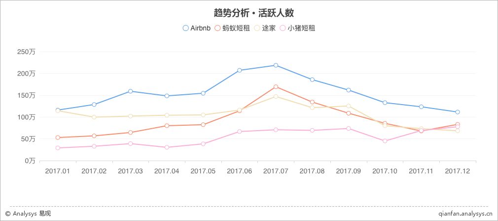 根据易观千帆12月监测数据显示,途家系月活跃用户人数达到151.42万,超越国际巨头Airbnb,继续保持领先位置。而整年来看,越是旅游旺季途家系领先优势越大。尤其在7月,月活跃人数领先97.794万。从这个角度来看,途家系已稳住了国内市场非标住宿的领先者地位。