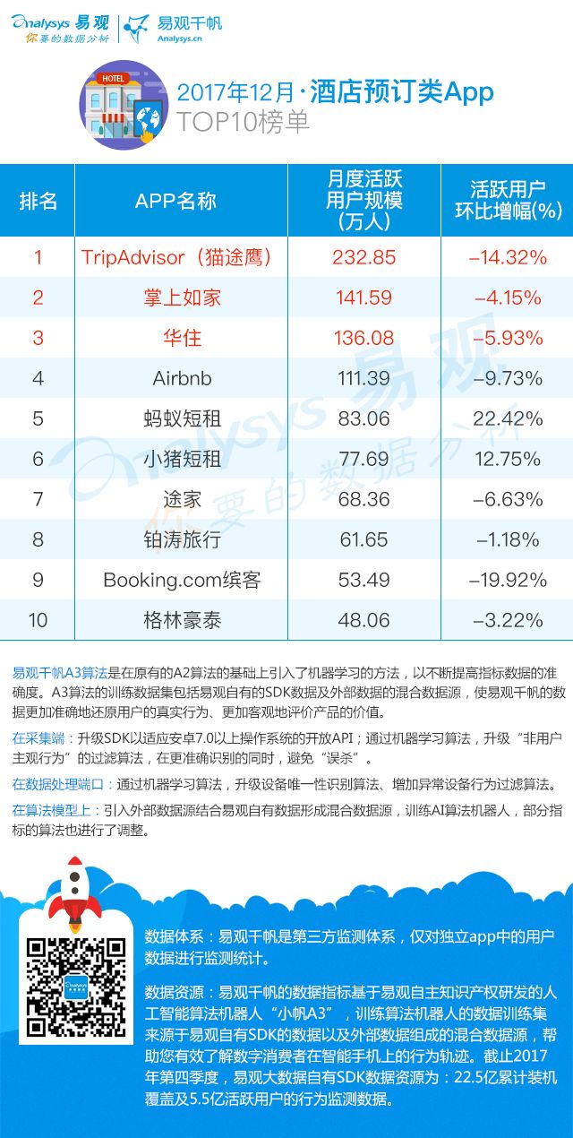 2017年,我国星级酒店营收略有下降,行业并购重组、转型案例增多。许多新势力趁机崛起:零售品牌宜家、无印良品、网易严选等纷纷开设生活美学酒店,拉开了零售业场景化销售新模式;Airbnb、途家、小猪发起非标住宿融资竞赛;高端酒店盈利预期下调、经济型酒店同质化严重刺激中端酒店崛起……在互联网渗透率不断提高的2017,互联网思维与技术加速着酒店业的资本、业务、模式的变革。那么互联网如何改变了酒店业? 我们从易观千帆12月监测的酒店预订类AppTOP10榜单来一窥究竟。