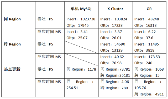 阿里还进行了 AliSQL X-Cluster 性能表现的测试,测试使用了三节点部署方式,分别在同城三机房、跨城三机房的网络环境下进行了测试,测试工具使用标准的 Sysbench 的 insert/oltp。