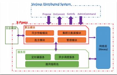 X-Paxos 的整体架构如上图所示,主要可分为网络层、服务层、算法模块、日志模块 4 个部分。