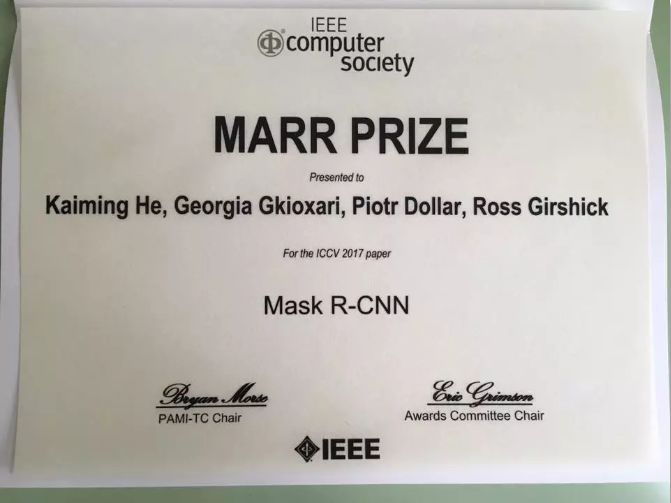 在Facebook AI实验室研究期间,何凯明仍然醉心于研究,而且颇有建树。2017年3月,何恺明和同事公布了其最新的研究Mask R-CNN,提出了一个概念上简单、灵活和通用的用于目标实例分割(object instance segmentation)框架,能够有效地检测图像中的目标,同时还能为每个实例生成一个高质量的分割掩码。同年,凭借《利用焦点损失提升物体检测效果》这篇论文,他一举夺下了另一个计算机视觉顶级会议ICCV最佳论文奖。