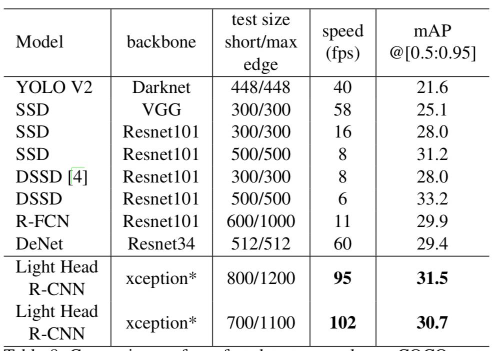 表 8. Light-Head R-CNN 检测器与其他检测器在 COCO test- dev 上的结果对比。Xception* 指小的 xception 如主干网络。通过添加一个小的基础模型,Light R-CNN 在准确率和速度上都达到了更好的表现,这表明该设计的灵活性。