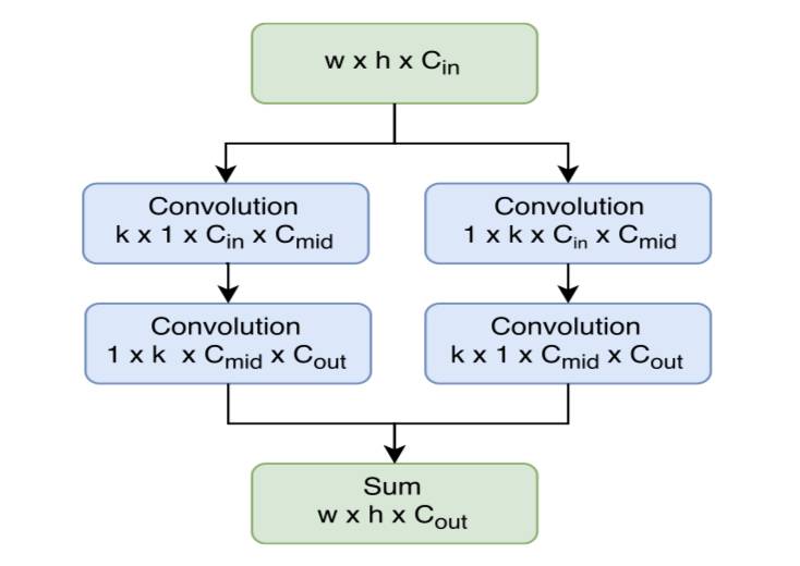 图 3. 大型可分卷积按顺序执行 k × 1 和 1 × k 卷积层。计算复杂度可以通过 C_mid 和 C_out 进一步进行控制。