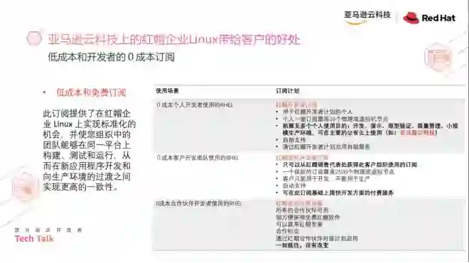 对于广大 RHEL 用户,亚马逊云科技上的红帽 RHEL 提供了覆盖全面、非常灵活的订阅计划。尤其面向个人开发者和企业开发者,红帽都准备了 0 成本的开发者可用订阅。