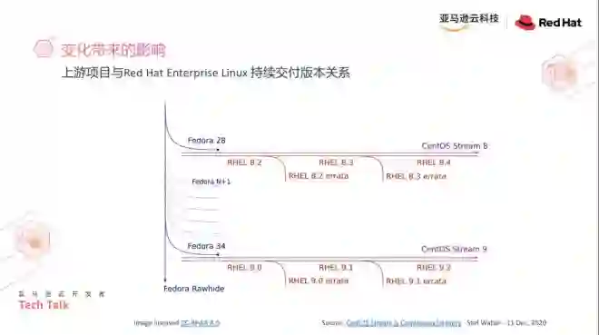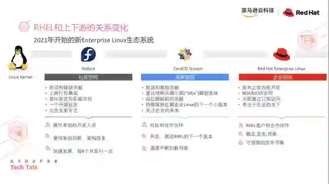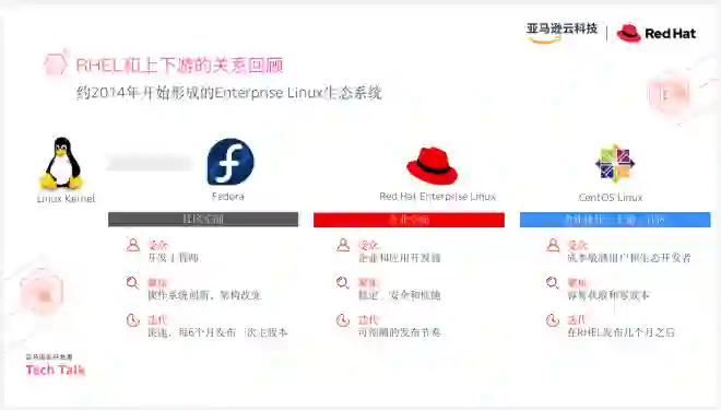 很多开发者无法理清 Linux 生态系统中各种版本之间的关系。那么我们首先做一个回顾,从 2014 年开始,红帽企业级 Linux 生态系统形成了 Fedora、RHEL 和 CentOS Linux 协同发展的局面。社区上游通过 Fedora 面向广大开发工程师提供桌面操作系统的持续创新和技术架构整合,大约每 6 个月发布一个版本;中游是红帽企业级 Linux,主要面向广大企业和应用开发商,特点是稳定、安全和性能优化,产品迭代和发展节奏有条不紊;下游就是社区领导的 CentOS Linux ,面向成本敏感用户和生态开发者。CentOS Linux 版本,产品迭代节奏紧跟 RHEL,用户在零成本获取的同时,一样可以享受到红帽 RHEL 的产品优势。
