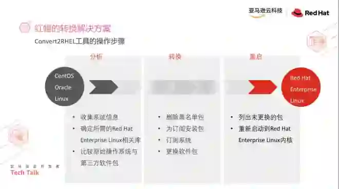 如果用户选择从 CentOS 转向 RHEL,亚马逊云科技提供一些工具来帮助用户完成任务,确保用户享受到红帽订阅的价值。