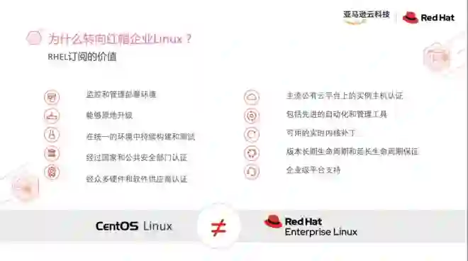 综上所述,可以看到 CentOS 是源于 RHEL 的,企业迁移到 RHEL 可以获得最大程度的安全性、稳定性、可靠性保障,也是对已有资产的最大保护。通过红帽提供的订阅、产品、服务,结合亚马逊云科技在 CentOS 转换过程中提供的服务和支持,能够帮助用户很好地解决 CentOS 停更带来的种种问题。