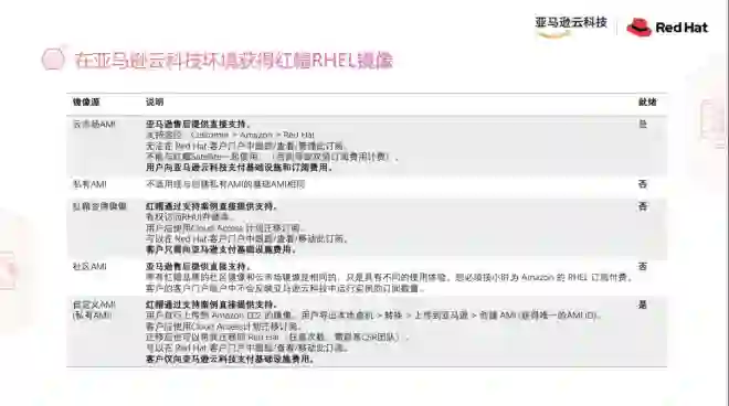 亚马逊云科技的环境也可以通过很多种方式使用红帽 RHEL 镜像,包括云市场 AMI、私有 AMI、自定义AMI 上云、官方发布的红帽金牌镜像、第三方合作伙伴提供的亚马逊 AMI 的版本等渠道获得。国内用户最直接的方式是云市场镜像、内置与构建镜像。如果没有适用版本或可用选项,RHEL 用户仍能通过红帽支持的自定义 AMI 镜像将 RHEL 迁移到亚马逊云科技。红帽支持标准商业订阅客户将数据中心的 on-promise 订阅直接部署到亚马逊云环境。