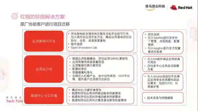 红帽会帮助用户进行项目迁移引导或者规划,提供一系列帮助和全方位管理服务。红帽在数据中心运营环境基础设施方面会帮助用户做评估梳理,在运行时方面帮助用户考察应用兼容性、迁移方案可行性,在应用开发优化方面也有相应的咨询协助。