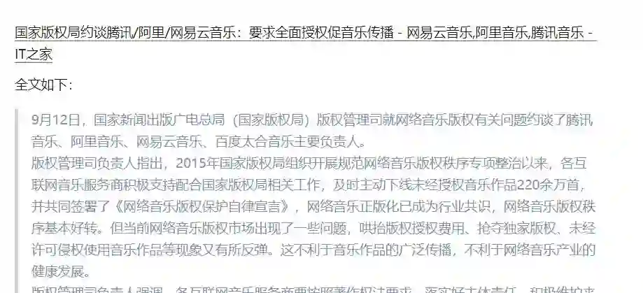 直到前两年,国家版权局约谈,要求这些巨头们的音乐平台放开独家授权,共享版权,情况一下子好转了。