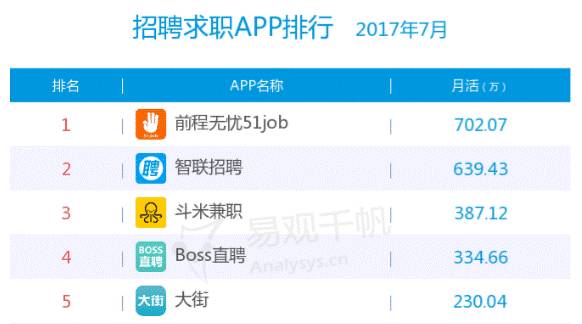 随着互联网招聘创业企业的崛起,给整个招聘行业带来了巨大的变化,越来越多的求职者更倾向于通过网站招聘寻找工作。易观千帆数据监测到,招聘求职类APP活跃用户已达到2,619.27万,其中前程无忧、智联招聘和斗米兼职分别以702.万、639.43万和387.12万排在了前三名。