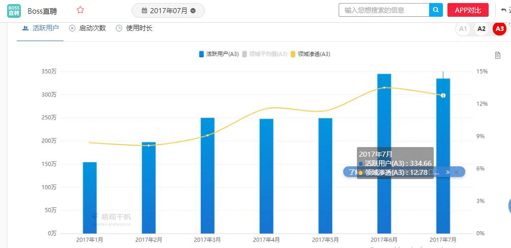 自2014年7月BOSS直聘上线以来,用户量可谓增长迅猛,但受传销事件影响,6月到7月活跃用户有所下滑,从6月份的344.79万降到了7月份的334.66万,相对来说,究竟事件对于BOSS直聘有多大影响还需要持续观察。